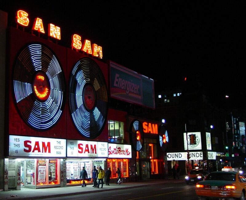 Today, Downtown Toronto is overpopulated with trendy, high-end boutiques, luxury high-rise condominiums, a knock-off of Times Square, and Ryerson's ever-increasing expansionism. However, this strip was once home to countless record stores, bookshops, video game arcades, and one-hour photo labs, many of which illuminated their storefronts with flashing neon signage at night. Here, you would find the undisputed mecca for Canadian music lovers, the Sam the Record Man flagship store. This was one of my absolute favourite hangouts around Yonge & Dundas, as not only did it stock its shelves with an impressive selection of music, but all the latest movies and video games as well. This is where I finally tracked down a copy of Garfield's Halloween Adventure after months of searching for it. I also remember one of the cashiers inviting me to play Wipeout on one of their PlayStation video game kiosks, which was my first exposure to Sony's then-new 32-bit console.